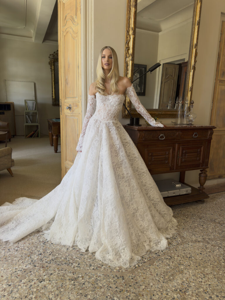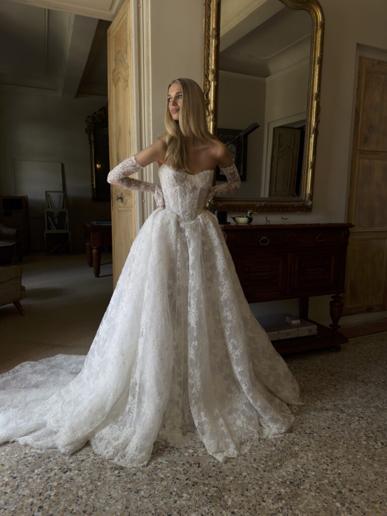 Tom Sébastien’s Provence bridal collection is a boho bride’s dream! It features delicate floral beading with ruched accents and detachable swag sleeves, intriguing slit skirts and plunging necklines, dreamy glitter tulle and sheer details galore. These wedding dresses are crafted using the finest Italian fabrics with high-end finishes to achieve the label’s signature luxurious aesthetic.