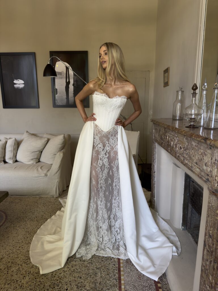 The Quinn SS25 collection draws inspiration from the authentic beauty and elegance of the Bridgertons era. This English period merges art and craftsmanship with the regal bridal look of a royal wedding. With exquisite tailoring and intricate constructions, fabrics sourced from France, and the unmistakable style of Tom Sebastien, the collection beautifully expresses a timeless aesthetic inspired by the Bridgestons’ refined charm.