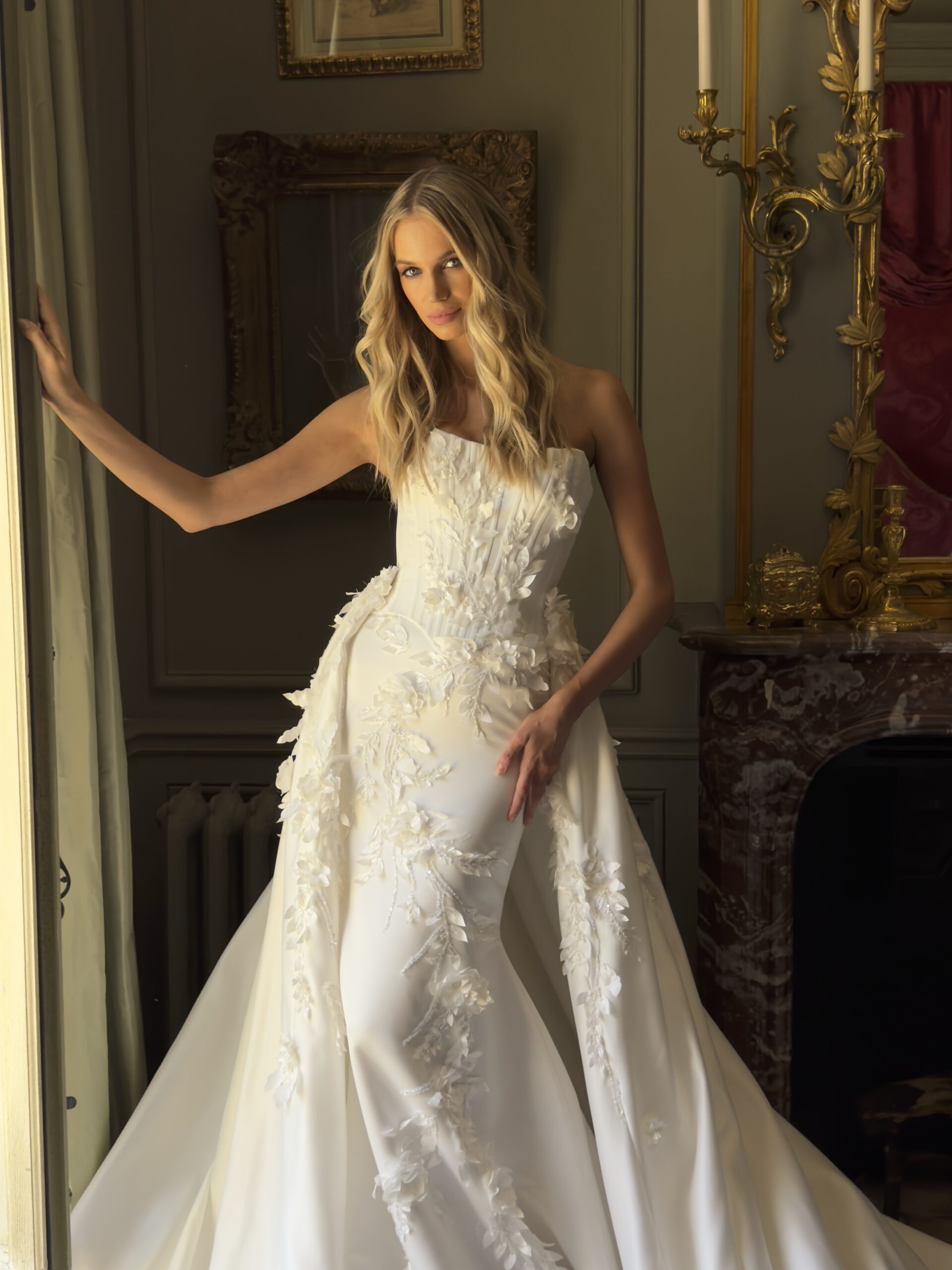 Each Tom Sébastien wedding gown is crafted according to our official size chart. Every piece is made to order and carefully personalized for each client. Thoughtful details, along with the option to add lining to the bodice or skirt if needed, are executed with the expertise of our Fashion House. Please contact your retailer to discuss customization options, order details, and the full creation process of your wedding gown.